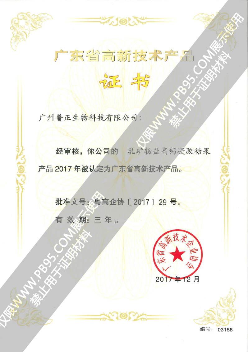 海藻鈣高鈣凝膠糖果——高新技術產(chǎn)品證書