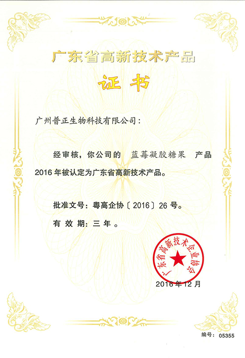 藍莓凝膠糖果——高新技術產(chǎn)品證書