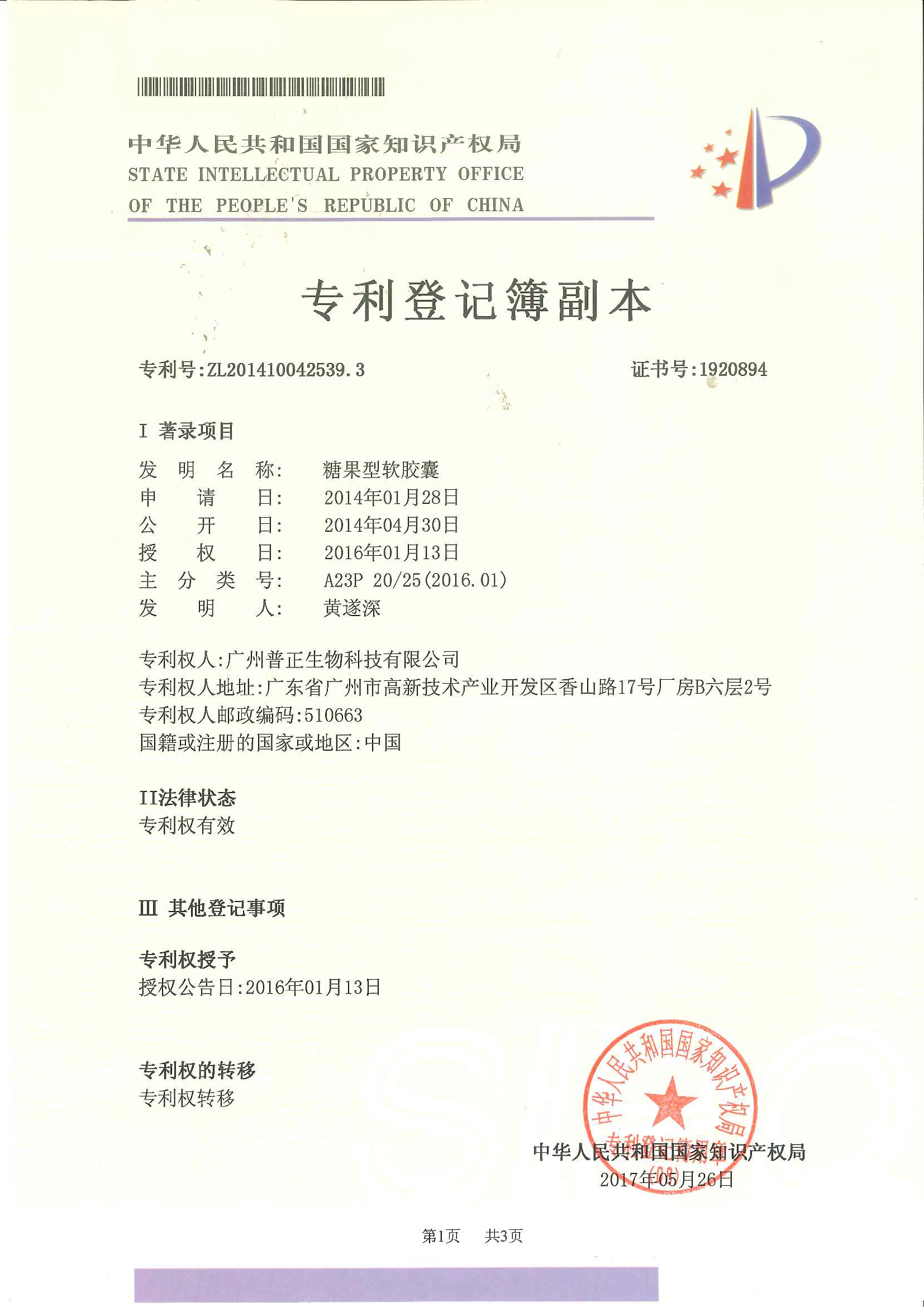 糖果型軟膠囊專利證書(發(fā)明專利號:ZL201410042539.3)