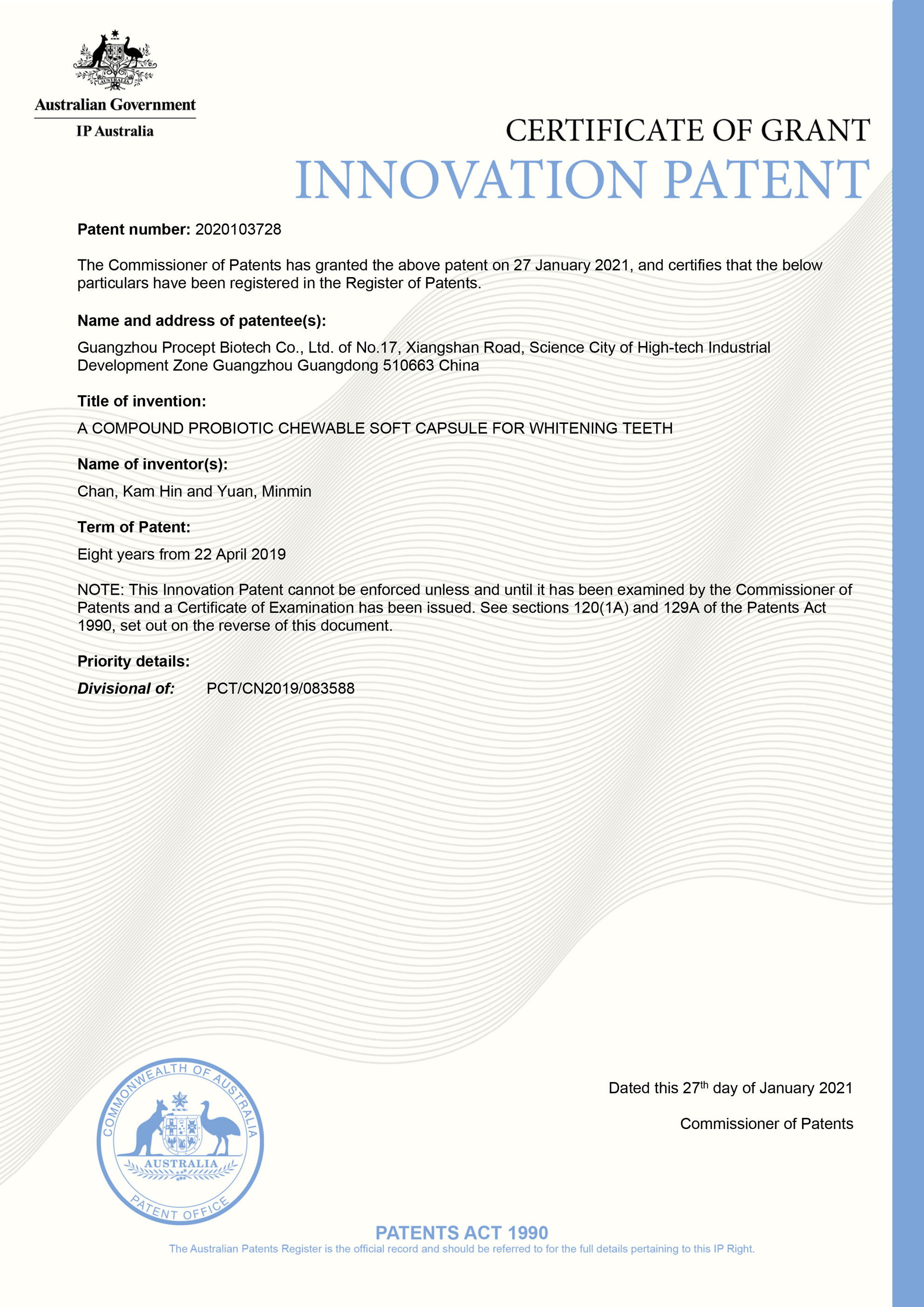 澳大利亞口腔益生菌專利證書(專利號:2020103728)